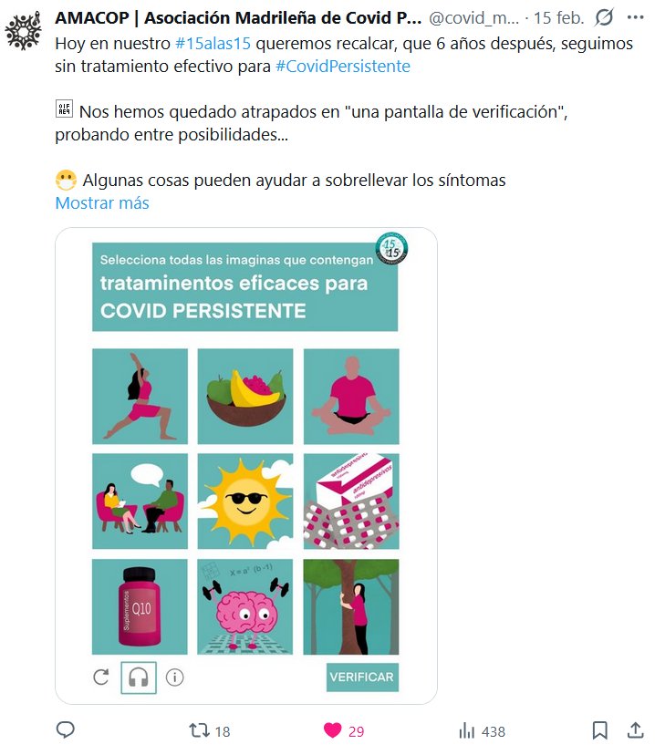 AMACOP | Asociación Madrileña de Covid Persistente @covid_madrid · 15 feb. 2026 Hoy en nuestro #15alas15 queremos recalcar, que 6 años después, seguimos sin tratamiento efectivo para #CovidPersistente Nos hemos quedado atrapados en «una pantalla de verificación», probando entre posibilidades…