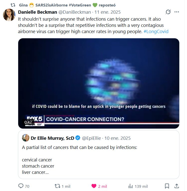 REITERAMOS Gina 😷 SARS2isAirborne #VoteGreen 💚 republicado Danielle Beckman @DaniBeckman · 11 ene. 2025 No debería sorprender a nadie que las infecciones puedan desencadenar cánceres. Tampoco debería sorprender que las infecciones repetidas con un virus muy contagioso que se transmite por el aire puedan provocar altas tasas de cáncer en jóvenes. #CovidProlongado
