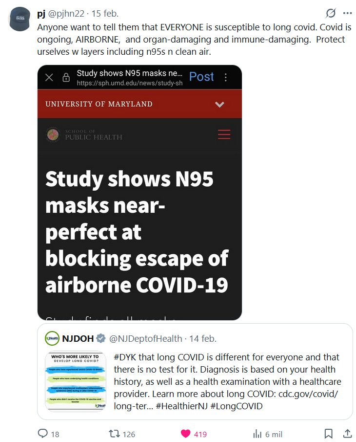 Pj @pjhn22 · 15 feb. 2026 ¿Alguien quiere decirles que TODOS son susceptibles al COVID prolongado? El COVID es una enfermedad continua, se transmite por el aire y daña los órganos y el sistema inmunitario. Protéjanse con capas de ropa, incluyendo mascarillas N95, y aire limpio.