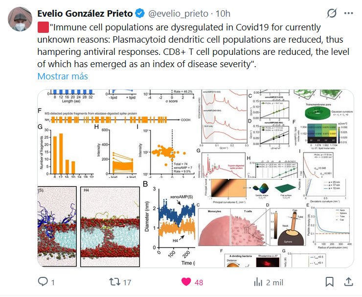 DR. Evelio González Prieto @evelio_prieto · 🟥»Las poblaciones de células inmunitarias están desreguladas en la COVID-19 por razones aún desconocidas: las poblaciones de células dendríticas plasmocitoides están reducidas, lo que dificulta la respuesta antiviral. Las poblaciones de linfocitos T CD8+ están reducidas, lo que se ha convertido en un indicador de la gravedad de la enfermedad». @fitterhappierAJ