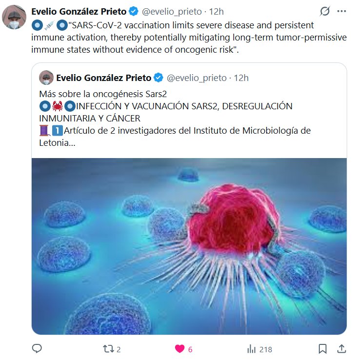 Dr. Evelio González Prieto @evelio_prieto · 🔘💉🔘»La vacunación contra el SARS-CoV-2 limita la gravedad de la enfermedad y la activación inmunitaria persistente, mitigando así potencialmente los estados inmunitarios permisivos tumorales a largo plazo sin evidencia de riesgo oncogénico».