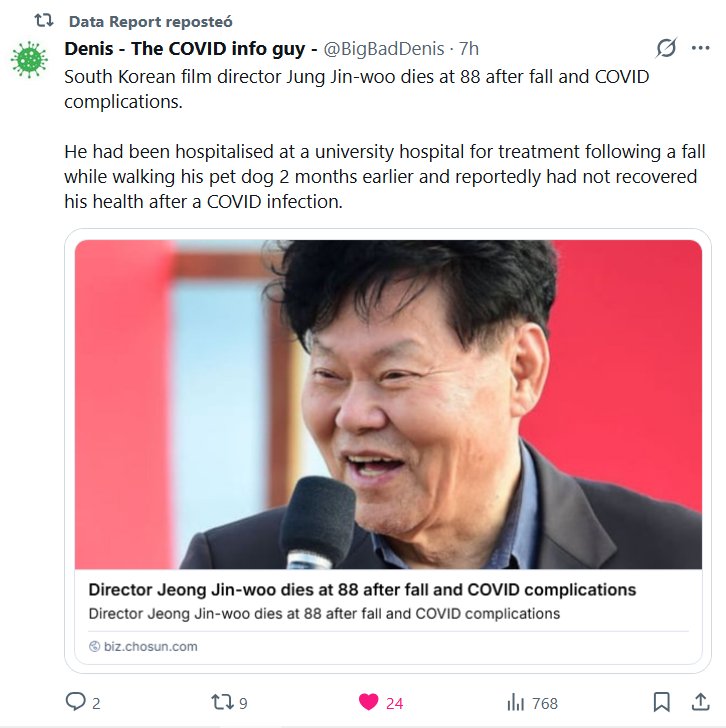 Data Report reposteó Denis – The COVID info guy – @BigBadDenis El director de cine surcoreano Jung Jin-woo fallece a los 88 años tras una caída y complicaciones derivadas de la COVID-19. Había estado hospitalizado en un hospital universitario para recibir tratamiento tras una caída mientras paseaba a su perro dos meses antes y, según informes, no se había recuperado de la COVID-19.