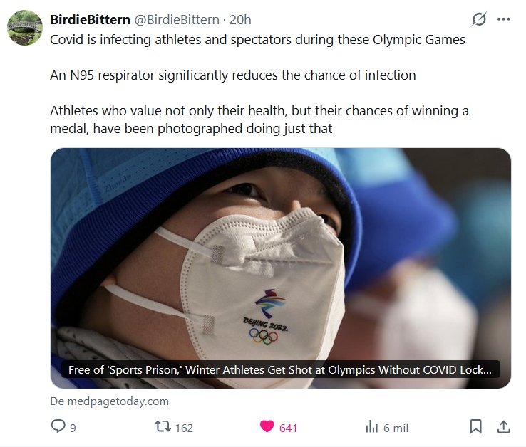 BirdieBittern @BirdieBittern · La COVID-19 está infectando a atletas y espectadores durante estos Juegos Olímpicos. Un respirador N95 reduce significativamente el riesgo de infección. Atletas que valoran no solo su salud, sino también sus posibilidades de ganar una medalla, han sido fotografiados haciendo precisamente eso.
