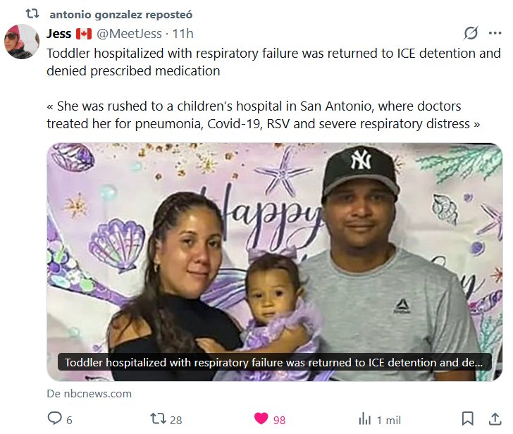 El profesor Antonio González repostó Jess 🇨🇦 @MeetJess · Niña hospitalizada con insuficiencia respiratoria fue devuelta al centro de detención de ICE y se le negaron los medicamentos recetados. « Fue trasladada de urgencia a un hospital infantil en San Antonio, donde los médicos la trataron por neumonía, COVID-19, VSR y dificultad respiratoria grave » Posted on febrero 9, 2026 por coronado https://www.nbcnews.com/news/us-news/toddler-hospitalized-dilley-ice-detention-rcna257912