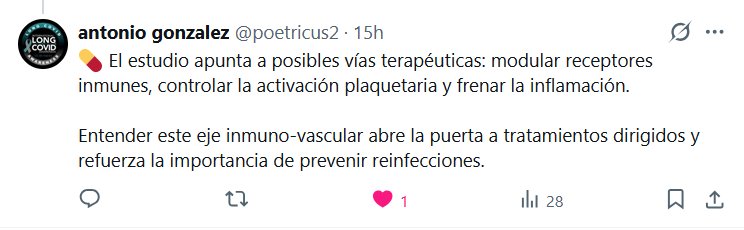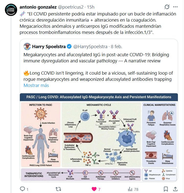Prof. Antonio González @poetricus2 · 🧬 «El COVID persistente podría estar impulsado por un bucle de inflamación crónica: desregulación inmunitaria + alteraciones en la coagulación. Megacariocitos anómalos y anticuerpos IgG modificados mantendrían procesos tromboinflamatorios meses después de la infección. Posted on febrero 9, 2026 por coronado