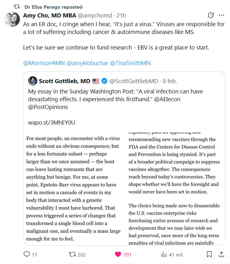 COMO POR EJEMPLO EL SARS-COV-2 La Dra. Elisa Perego repostó Amy Cho, MD MBA @amychomd · Como médica de urgencias, me estremezco cuando escucho: «Es solo un virus». Los virus son responsables de mucho sufrimiento, incluyendo cáncer y enfermedades autoinmunes como la esclerosis múltiple (EM). Asegurémonos de seguir financiando la investigación: el virus de Epstein-Barr (VEB) es un excelente punto de partida. Posted on febrero 9, 2026 por coronado https://x.com/ScottGottliebMD/status/2020483633341927764 https://www.washingtonpost.com/opinions/2026/02/06/viruses-vaccines-ebv-lymphoma-measles-fda-commissioner/