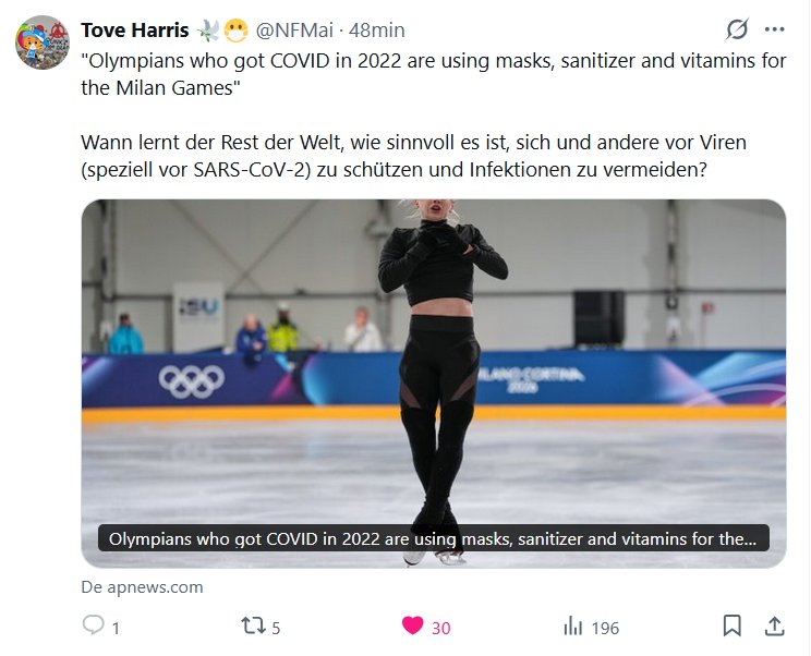 EN INGLÉS Y ALEMÁN Tove Harris 🕊😷 @NFMai · «Los atletas olímpicos que contrajeron COVID en 2022 usan mascarillas, desinfectante y vitaminas para los Juegos de Milán». ¿Cuándo aprenderá el resto del mundo lo importante que es protegerse a uno mismo y a los demás de los virus (especialmente el SARS-CoV-2) y evitar las infecciones? Posted on febrero 9, 2026 por coronado https://apnews.com/article/olympics-milan-cortina-covid-pandemic-6e7d0c6339170500de7ba8e7db3229d7