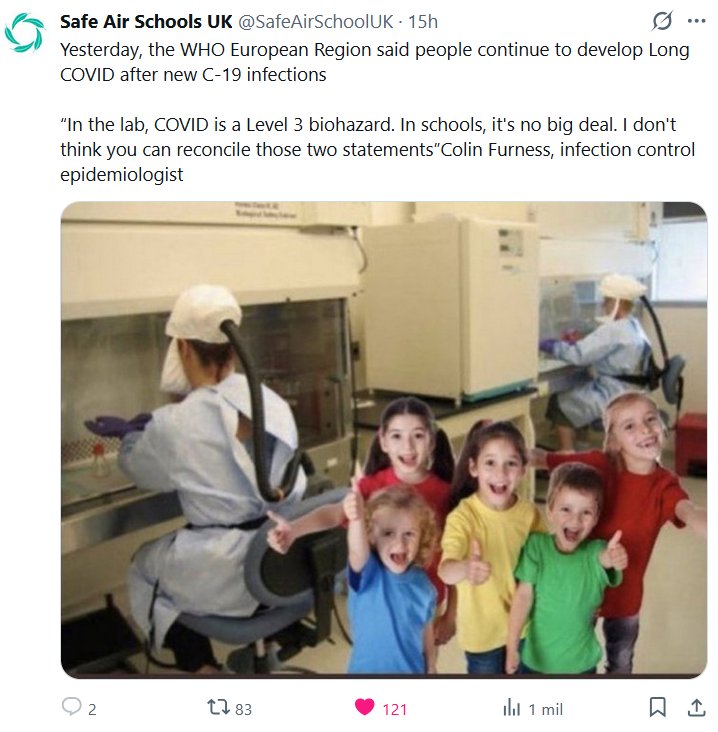 Escuelas de Aire Seguro en el Reino Unido @SafeAirSchoolUK · Ayer, la Región Europea de la OMS indicó que las personas siguen desarrollando COVID persistente tras nuevas infecciones por COVID-19. “En el laboratorio, la COVID es un riesgo biológico de nivel 3. En las escuelas, no es un gran problema. No creo que se puedan conciliar ambas afirmaciones”, Colin Furness, epidemiólogo de control de infecciones.