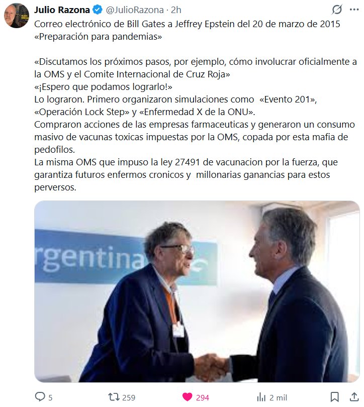 Julio Razona @JulioRazona · Correo electrónico de Bill Gates a Jeffrey Epstein del 20 de marzo de 2015 «Preparación para pandemias» «Discutamos los próximos pasos, por ejemplo, cómo involucrar oficialmente a la OMS y el Comite Internacional de Cruz Roja» «¡Espero que podamos lograrlo!» Lo lograron.