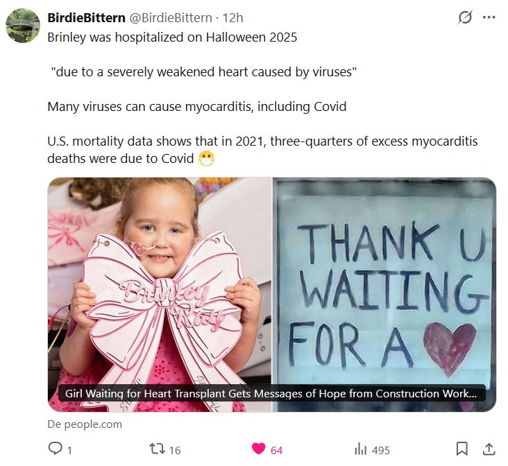 BirdieBittern @BirdieBittern · Brinley fue hospitalizado en Halloween de 2025 «debido a un debilitamiento cardíaco grave causado por virus». Muchos virus pueden causar miocarditis, incluido el COVID-19. Los datos de mortalidad en EE. UU. muestran que en 2021, tres cuartas partes del exceso de muertes por miocarditis se debieron al COVID-19.
