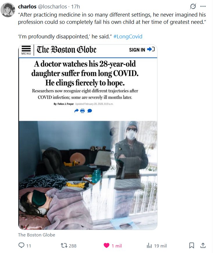 Charlos @loscharlos · “Después de ejercer la medicina en tantos entornos diferentes, nunca imaginó que su profesión podría fallarle tan completamente a su propia hija en su momento de mayor necesidad”. “Estoy profundamente decepcionado”, dijo. #CovidProlongado