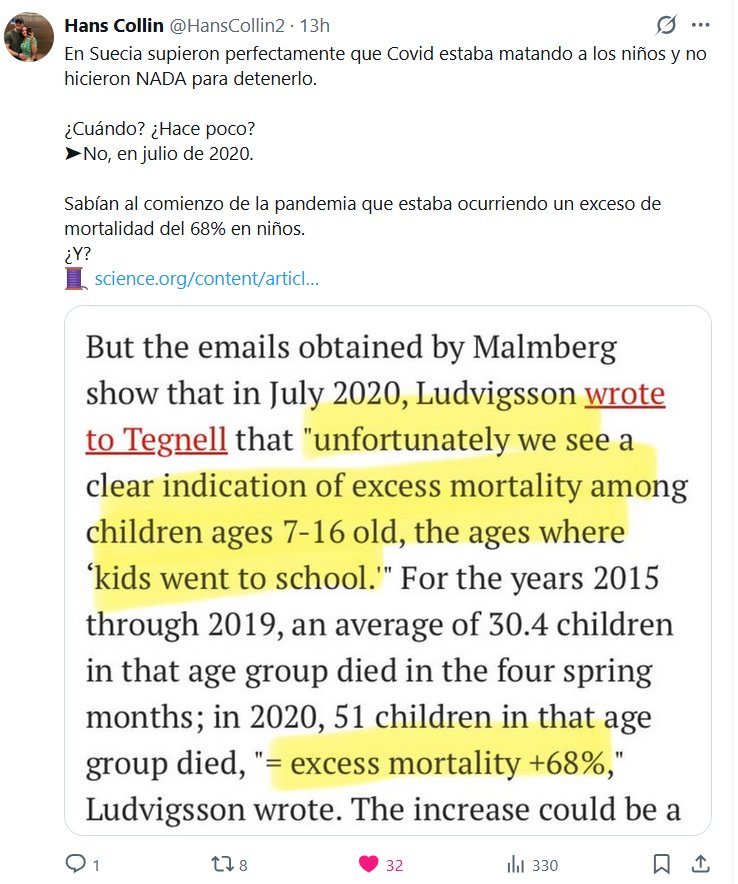 Hans Collin @HansCollin2 · En Suecia supieron perfectamente que Covid estaba matando a los niños y no hicieron NADA para detenerlo. ¿Cuándo? ¿Hace poco? ➤No, en julio de 2020.