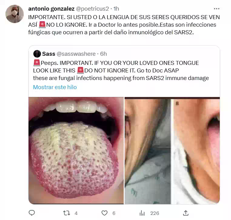 COVID=SIDA2! IMPORTANTE. SI USTED O LA LENGUA DE SUS SERES QUERIDOS SE VEN ASÍ 🚨NO LO IGNORE. Ir a Doctor lo antes posible.Estas son infecciones fúngicas que ocurren a partir del daño inmunológico del SARS2